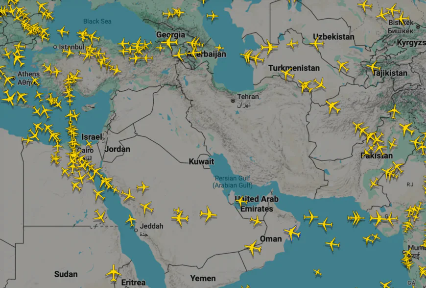 The photo shows the no-fly zone over the Middle East. Global air travel remained heavily disrupted as war in Iran kept major Middle Eastern airports closed. Photo: Flightradar24