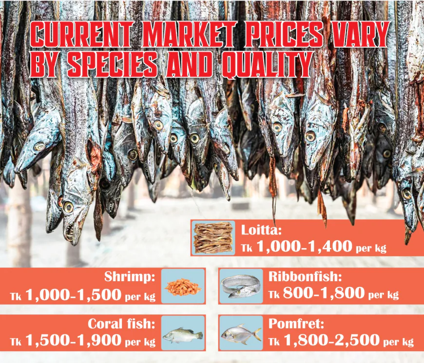 Throughout the peak production season from November to April, an estimated 60,000 tonnes of shutki are processed using traditional sun-drying methods, where a diverse workforce—predominantly composed of women—meticulously prepares more than 25 marine species on bamboo racks.