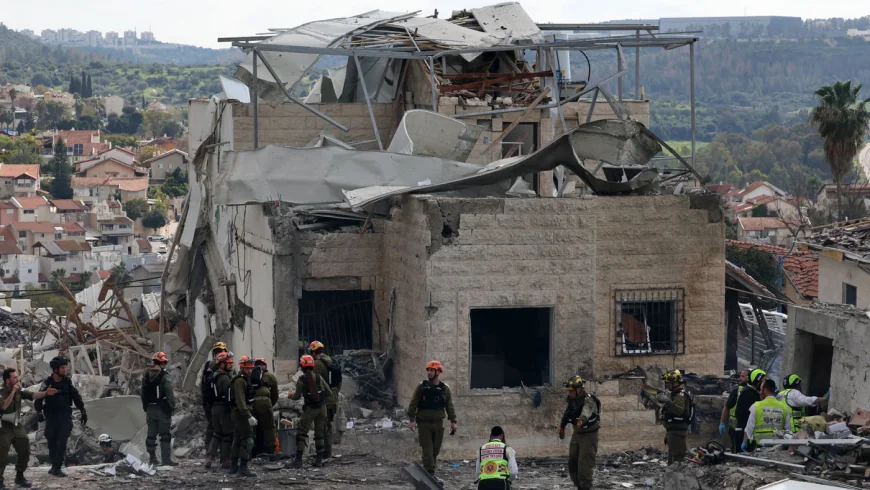 A drone view of the scene of a fatal Iranian strike in Beit Shemesh, Israel, March 1. At least 9 people are confirmed to have died from this attack. Photo: Reuters/Ilan Rosenberg