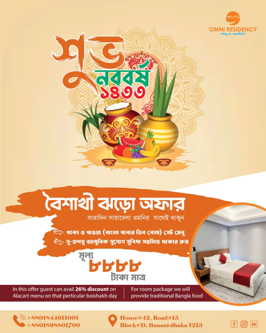 Dhaka's high-end Omni Residency has rolled out a special festive stay package styled the 'Stormy Boishakhi Offer', designed to celebrate the Bangla New Year with a blend of traditional hospitality, comfort and value-for-money pricing for guests in Dhaka.